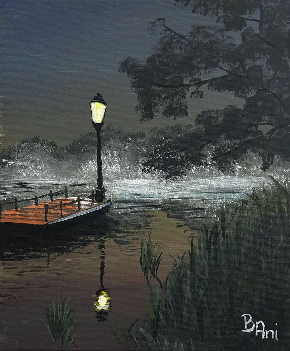 EN: “Whispers of the Night” captures the quiet magic of an evening by the lake. The gentle glow of a single lamp reflects softly on the water, surrounded by mist and the calm stillness of nature. The atmosphere invites contemplation — a dialogue between light and darkness, silence and reflection. Painted with multilayered acrylics and subtle glazing, this artwork was created with exceptional attention to mood and detail. After full drying, it was varnished to preserve the depth, glow, and serenity of the scene. The painting can be custom ordered in different sizes. Please contact the artist for a personalized quote. Each custom version requires about two weeks for completion due to careful layering and drying times. HU: A „Whispers of the Night” a tóparti éjszaka csendes varázsát ragadja meg. A magányos lámpa fénye lágyan tükröződik a vízen, miközben a párás levegő és a sötétség békés, elmélkedésre hívó hangulatot teremt. A kép a fény és árnyék, a csend és tükröződés közötti párbeszédet idézi. A festmény többrétegű akriltechnikával, finom lazúros hatásokkal készült, majd lakkozással zárult, hogy megőrizze a jelenet mélységét, fényét és nyugalmát. A festmény eltérő méretben is megrendelhető, egyedi árajánlat alapján. Az elkészítéshez általában két hét szükséges a rétegek száradási ideje miatt.