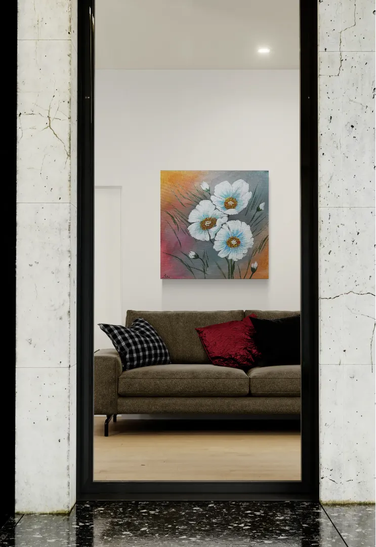 EN: “Sunset Blossoms” is a radiant floral composition where delicate white flowers bloom against a glowing, sunset-inspired gradient. Soft blues and whites blend harmoniously with vibrant orange and warm grey tones, while subtle gold accents highlight the petals and stems, creating a luxurious and uplifting effect. Painted with multilayered acrylics, shimmering gold contours, and textured floral centers, this artwork was crafted with exceptional precision to evoke lightness, joy, and elegance. After complete drying, the painting was sealed with varnish to protect its colors, sheen, and refined details. The artwork can be custom ordered in different sizes. Please contact the artist for a personalized quote. Each custom order requires approximately two weeks due to the layering and drying processes. HU: A „Sunset Blossoms” egy ragyogó virágkompozíció, ahol a finom fehér virágok egy naplemente ihlette, izzó háttér előtt nyílnak. A lágy kékes-fehér árnyalatok harmonikusan találkoznak a vibráló narancs és meleg szürke tónusokkal, miközben az arany kontúrok elegáns fényt adnak a szirmoknak és a leveleknek. A festmény többrétegű akriltechnikával, csillogó arany kiemelésekkel és texturált virágközéppel készült, rendkívüli alapossággal, hogy a könnyedség, öröm és elegancia érzését közvetítse. A teljes száradást követően lakkozással lett lezárva, amely tartósan védi a színeket és a finom részleteket. A festmény eltérő méretben is rendelhető. Egyedi árajánlat kérhető, az elkészítés pedig általában két hetet igényel a rétegek száradási ideje miatt.