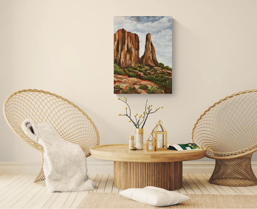 EN: “Red Desert Guardians” captures the timeless majesty of towering sandstone formations rising from the warm, sunlit desert floor. Inspired by the iconic landscapes of the American Southwest, this artwork highlights the earthy reds, deep browns, and rugged textures that define these monumental rock formations. Painted with multilayered acrylics and meticulous brushwork, the piece emphasizes natural contrast—soft desert shrubs against the monumental cliffs, and bright sky against ancient stone. After full drying, the painting was varnished to preserve its depth, colors, and texture for many years. This artwork can be custom ordered in different sizes. Please contact the artist for a personalized quote. Custom orders typically require about two weeks due to the layering process and drying times. HU: A „Red Desert Guardians” a monumentális homokkő sziklák örök méltóságát jeleníti meg, ahogy büszkén emelkednek a meleg, napsütötte sivatagi talajból. A festmény az amerikai délnyugat ikonikus tájképeit idézi, a vöröses, barnás földszínek és a robusztus formák természetes harmóniájával. A mű többrétegű akriltechnikával és részletgazdag ecsetvonásokkal készült, kiemelve a természet kontrasztját — az apró sivatagi növények finomságát a hatalmas sziklafalak előtt, valamint az ég világosságát az ősi kőzetekkel szemben. A teljes száradás után a festményt lakkozással zártad, hogy hosszú éveken át megőrizze mélységét, színeit és textúráját. A festmény eltérő méretben is rendelhető, egyedi árajánlat alapján. Az elkészítés általában két hét, a rétegek száradási idejének figyelembevételével.