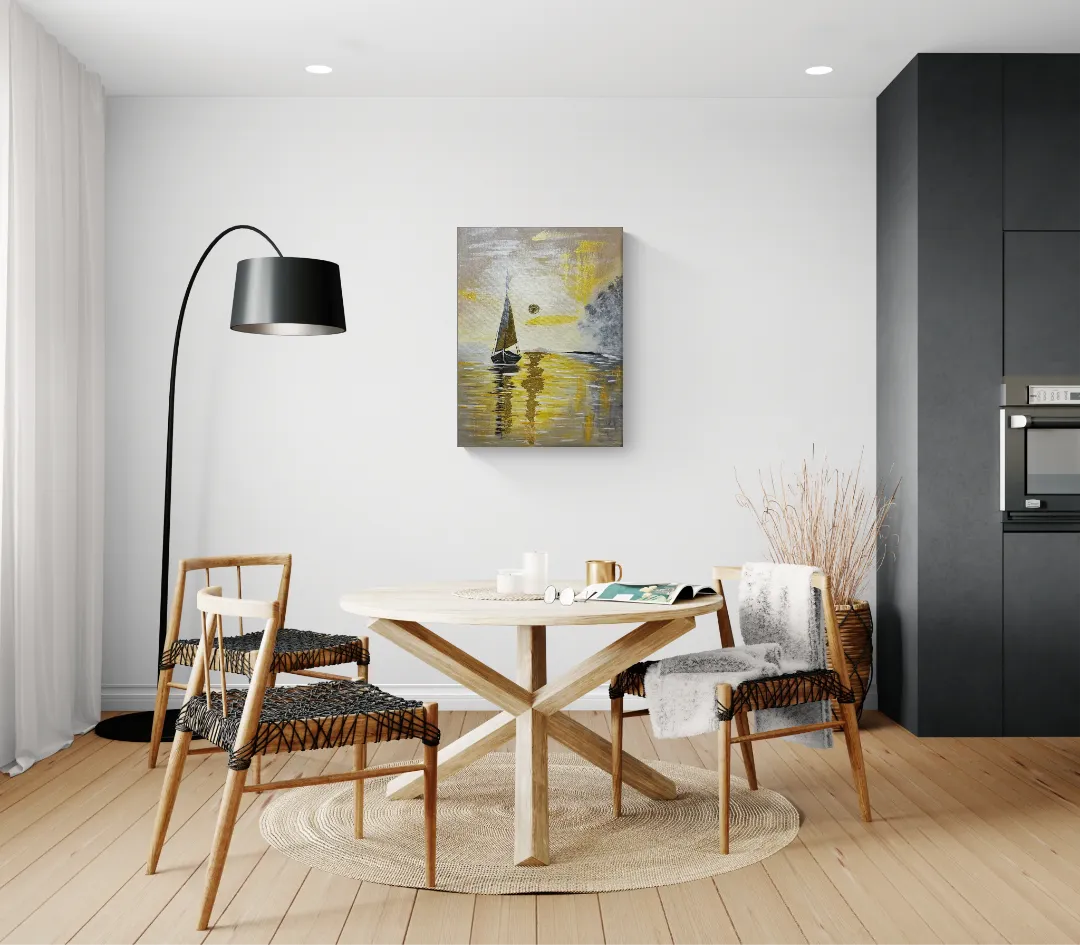 EN: “Golden Voyage” is a serene, atmospheric seascape where a lone sailboat drifts across shimmering golden waters. Soft metallic gold accents illuminate the sky and reflect on the surface, creating a warm, meditative glow. The minimalistic composition—balanced by subtle grays and gentle brushstrokes—invites stillness, introspection, and the quiet poetry of the open water. Painted with multilayered acrylics, enriched with gold leaf, metallic pigments, and textured highlights, this artwork was crafted with meticulous attention to elegance and harmony. After fully drying, it was varnished to protect its delicate metallic sheen and ensure long-lasting brilliance. This painting can be custom ordered in different sizes. Please contact the artist for a personalized quote. Each custom order typically requires about two weeks due to the drying and layering processes. HU: A „Golden Voyage” egy hangulatos, megnyugtató tengeri tájat ábrázol, ahol a magányos vitorlás aranyló víztükrön siklik. A finom metál arany fények bevilágítják az eget és visszatükröződnek a víz felszínén, meleg, meditatív ragyogást teremtve. A letisztult kompozíció — szürkés tónusokkal és lágy ecsetvonásokkal — csendességre, elmélyülésre és a nyílt víz költői szépségére hív. A festmény többrétegű akriltechnikával készült, aranyfólia, metál pigmentek és texturált kiemelések felhasználásával, rendkívüli alapossággal a harmónia és elegancia kifejezésére. A teljes száradás után védőlakkal lett lezárva, hogy tartósan megőrizze fémes ragyogását. A festmény eltérő méretben is rendelhető. Egyedi árajánlatért érdemes felvenni a kapcsolatot a művésszel. Az elkészítés általában két hetet igényel, a rétegek és a metál felületek száradási ideje miatt.