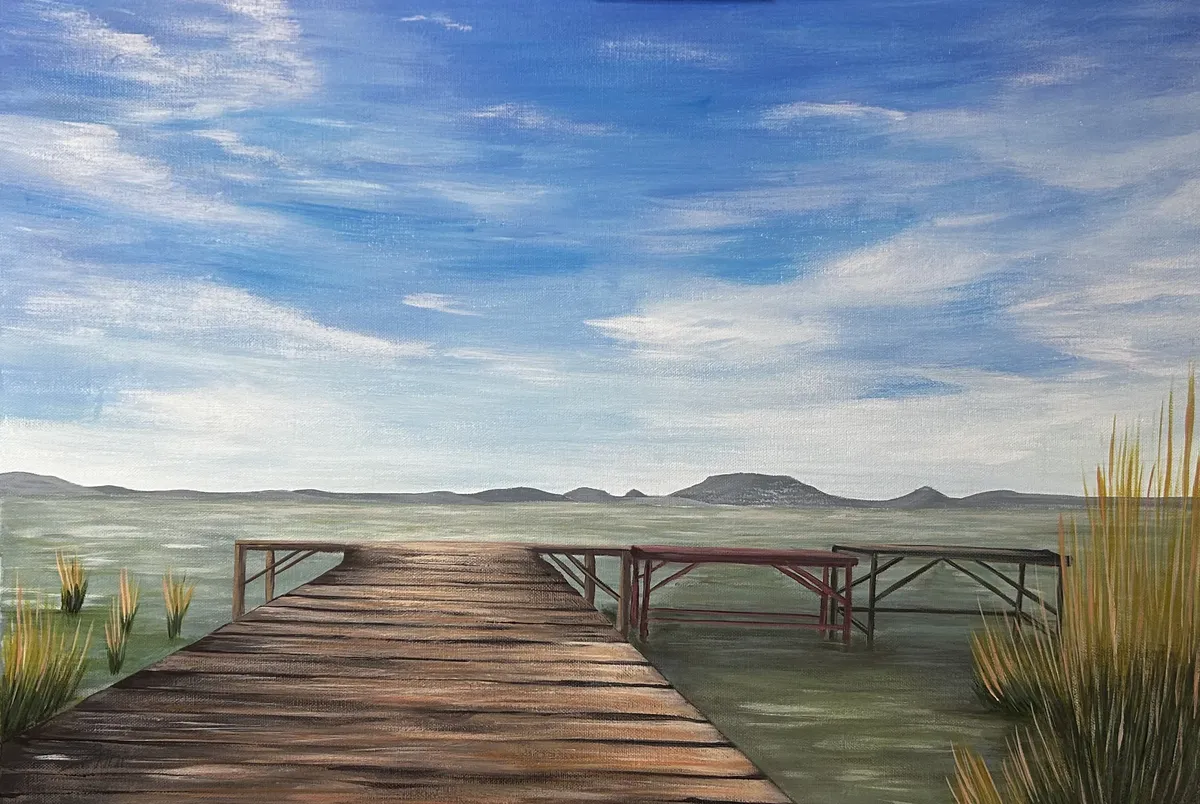 Description (EN) This painting invites the viewer to Balaton lake onto a quiet wooden pier stretching into calm, greenish water beneath a wide, open sky. The soft clouds and distant hills create a sense of depth and peaceful anticipation, as if the pier were leading not only across the lake, but inward, toward stillness and reflection. Painted with layered acrylic techniques, the work emphasizes perspective, light, and atmosphere. Subtle color transitions and natural brushwork give the surface a calm rhythm, making the painting an ideal companion for spaces meant for rest, contemplation, or creative focus. This artwork can also be custom ordered in different sizes. Due to drying times and layering, the artist typically needs approximately two weeks to complete a custom version. ⸻ Leírás (HU) Ez a balatoni festmény egy csendes, fából készült stégre hívja a nézőt, amely a nyugodt, zöldes víz fölé nyúlik, egy tágas, levegős égbolt alatt. A lágy felhők és a távoli dombok mélységet és várakozást sugallnak – mintha a stég nemcsak a tó fölé, hanem befelé, a belső csend felé vezetne. A több rétegben felvitt akrilfesték kiemeli a perspektívát, a fényt és a hangulatot. A finom színátmenetek és természetes ecsetkezelés nyugodt ritmust adnak a képnek, így tökéletes választás pihenésre, elmélyülésre vagy alkotásra szánt terekbe. A festmény egyedi megrendelésre más méretben is elkészíthető. A rétegezés és száradási idők miatt az elkészítés általában körülbelül két hetet vesz igénybe.