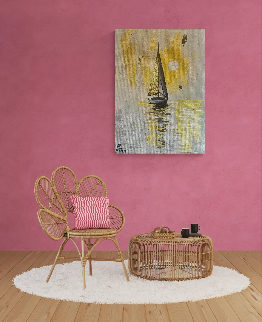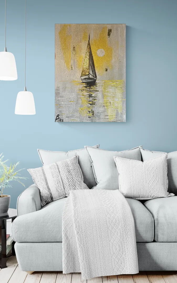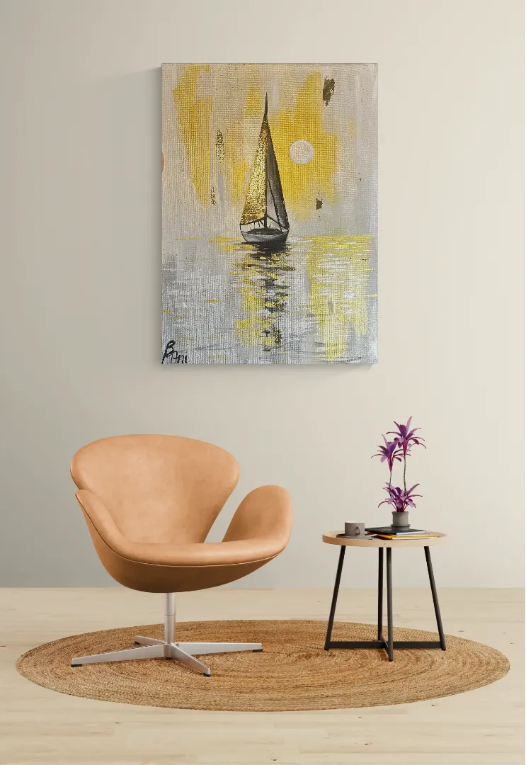 ENGLISH Golden Silence is an original acrylic painting depicting a solitary sailboat drifting across a calm, reflective water surface. The composition is built around soft neutrals and warm golden tones, creating a quiet, meditative atmosphere. The metallic gold sail catches the light subtly, symbolizing inner direction, hope, and stillness. The intention behind this artwork was to create a moment of pause — a visual silence where movement and calm exist simultaneously. The painting was created with exceptional care and precision, using multiple layers of high-quality acrylic paint. Selected areas were enriched with metallic gold accents to add depth and a refined glow. After complete drying, the painting was professionally varnished to ensure durability, color protection, and long-term preservation. The artwork is available in its original size. It can also be custom ordered in different dimensions, including stretched canvas on a wooden frame. For custom sizes, please contact me directly for a personalized quote. Due to drying and finishing times, I usually need approximately two weeks to complete a commissioned piece. ⸻ MAGYAR Az Arany csend című eredeti akrilfestmény egy magányos vitorlást ábrázol, amely csendesen siklik a tükröződő víz felszínén. A visszafogott, neutrális tónusok és a meleg arany árnyalatok meditatív, elcsendesedett hangulatot teremtenek. A metál arany vitorla finoman veri vissza a fényt, a belső irányt, reményt és nyugalmat szimbolizálva. A festmény célja egy megállított pillanat megteremtése volt — ahol a mozgás és a csend egyszerre van jelen. Rendkívüli alapossággal, több rétegben építettem fel, minőségi akrilfestékekkel dolgozva. Egyes részeket metál arany részletekkel emeltem ki a mélység és az elegáns fényhatás érdekében. A teljes száradást követően a festmény lakkozást kapott, amely biztosítja a tartósságot, a színek védelmét és az időtállóságot. A bemutatott méret mellett a festmény egyedi méretben is megrendelhető, akár fakeretre feszített vásznon. Egyedi igény esetén kérlek, vedd fel velem a kapcsolatot, és árajánlatot adok. Az elkészítéshez – a száradási idők betartása miatt – általában két hétre van szükségem.