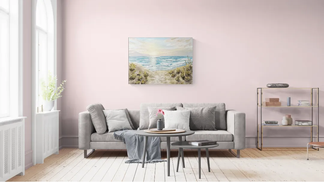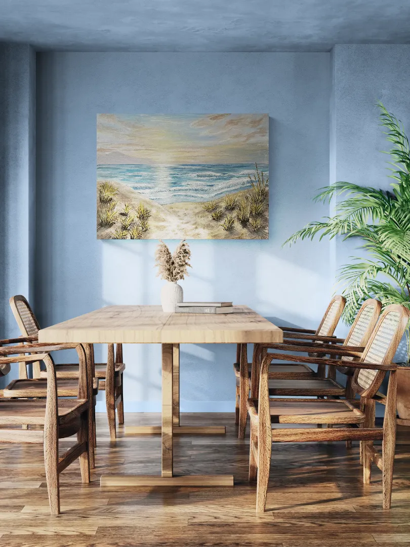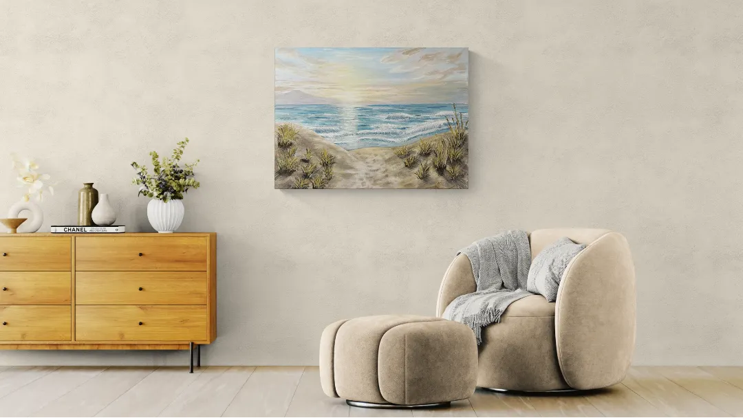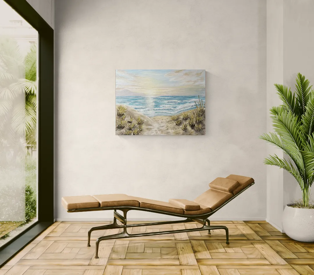 "This painting captures the quiet moment of dawn, when a sandy path between dunes gently leads the eye toward the sea. The muted, natural palette, soft light, and calm wave patterns evoke a sense of peace, new beginnings, and inner clarity. Rather than depicting a specific place, the composition represents a state of being — a moment when everything is still possible. Each of my paintings comes with a Certificate of Authenticity (COA). The artwork is available in multiple sizes and can also be commissioned. Creation time is approximately 14 working days. Custom requests are welcome upon prior consultation." HU: Ez a festmény a hajnal csendes pillanatát ragadja meg, amikor a homokdűnék között futó ösvény a tenger felé vezeti a tekintetet. A visszafogott, természetes színvilág, a lágy fények és a finom hullámmozgás a nyugalom, az elindulás és a belső tisztulás érzetét közvetítik.