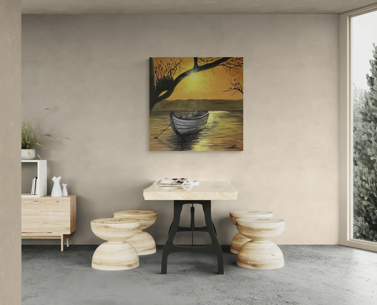 "A quiet boat rests on still water beneath the gentle glow of a pale sky. Soft reflections, muted tones, and the arching branches above create a moment of calm suspension—where time slows and silence becomes presence. This painting invites the viewer into a contemplative shoreline scene, evoking balance, solitude, and inner peace. The artwork is available in multiple sizes and can also be commissioned on request. Custom versions are created within 14 working days, and individual preferences are welcome by prior arrangement." HU: "Egy magányos csónak pihen a nyugodt vízen, a halvány fényben derengő ég alatt. A finom tükröződések, visszafogott színek és az ívesen föléhajló ágak időtlen, elcsendesedett pillanatot teremtenek – ahol a csend önmagává válik. A festmény a belső nyugalom, az egyensúly és az elmélyülés érzését hordozza. A festmény többféle méretben is elérhető, valamint megrendelésre is készül. Az egyedi alkotások 14 munkanapon belül készülnek el, és egyéni igények egyeztetés szerint vállalhatók."