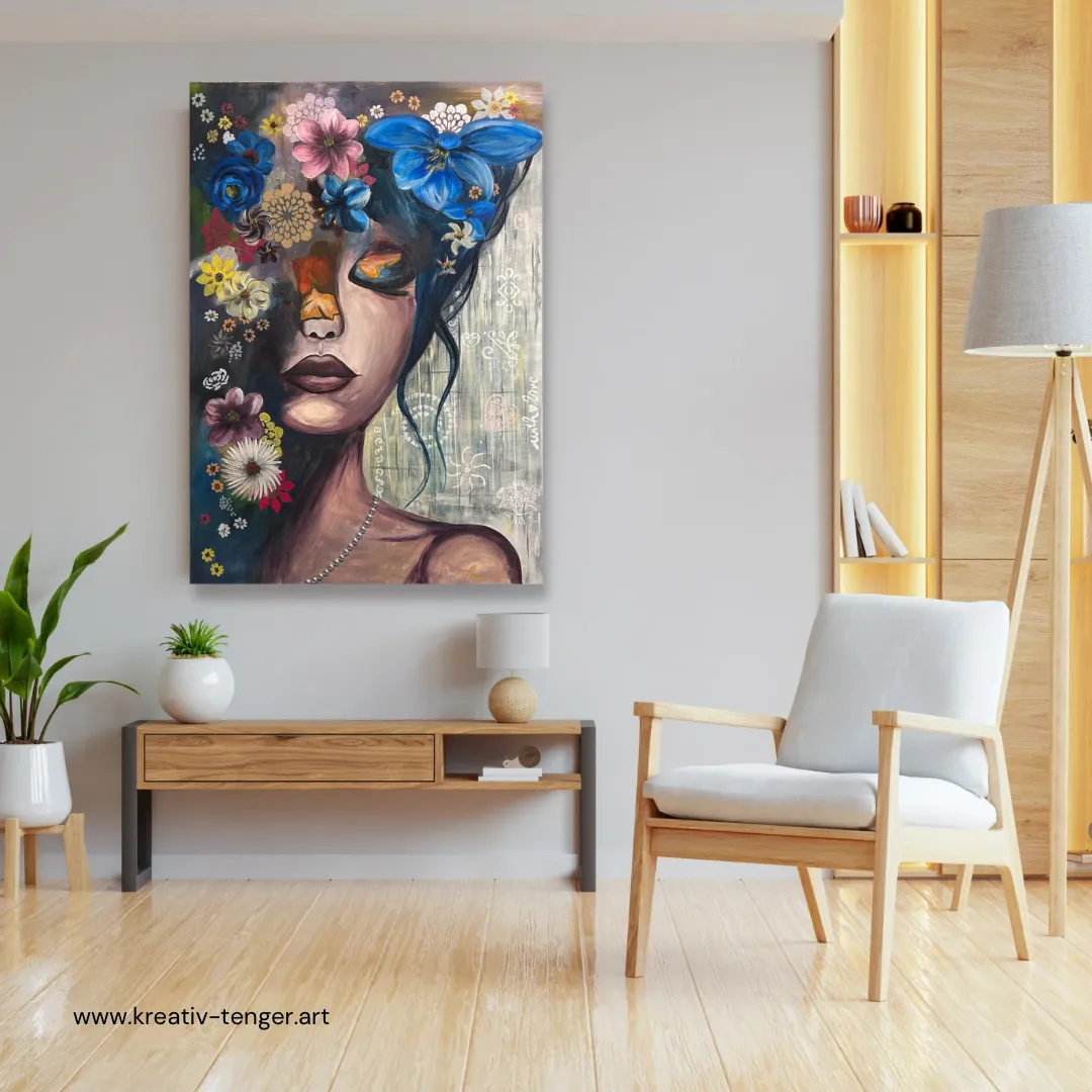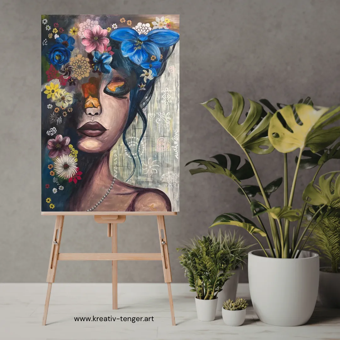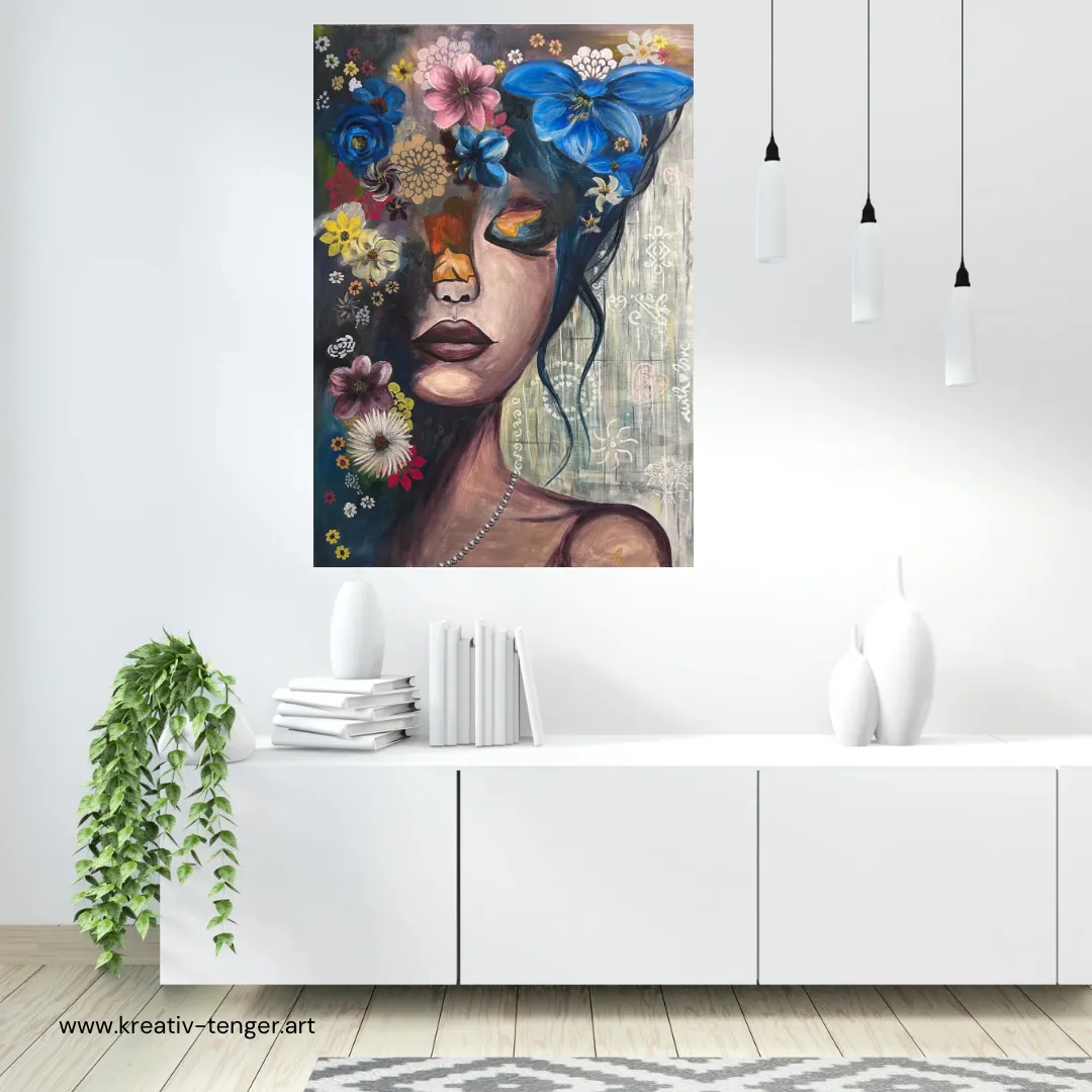 This 50×70 cm acrylic painting invites the viewer into an inner world where silence is not empty, but full of life. The gently closed eyes of the female figure symbolize introspection and inner peace, while the surrounding blooming flowers represent emotions, thoughts, and memories unfolding in harmony. The unique atmosphere of the painting is created by the interplay of deep shadows and vibrant floral elements. Cool blue tones evoke calmness, balanced by warmer hues that bring subtle energy and warmth into the composition. Delicate patterns and textures add depth, created through a layered acrylic technique. A distinctive feature of this artwork is the necklace, made from real silver-like beads, adding a tactile, three-dimensional element. Some flowers are enhanced with subtle shimmer, allowing light to interact beautifully with the surface. The painting is built up in multiple layers using acrylic techniques and finished with a protective varnish to ensure durability and long-lasting color vibrancy. This painting is available in different sizes upon request. Custom orders typically require 14 working days due to drying times between layers. I am happy to discuss individual ideas and preferences.----Ez az 50×70 cm-es akrilfestmény egy belső világba vezet, ahol a csend nem üres, hanem élettel teli. A női arc finoman zárt szemei a befelé figyelést, az elmélyülést idézik, miközben a körülötte kibontakozó virágok az érzelmek, gondolatok és emlékek sokszínűségét szimbolizálják. A festmény különleges atmoszféráját a mély, kontrasztos árnyékok és a ragyogó, élénk virágmotívumok együttese adja. A kék tónusok nyugalmat sugároznak, míg a melegebb színek finoman egyensúlyozzák ezt a harmóniát. A részletekben megjelenő finom minták és textúrák egyedi, rétegzett technikával készültek. A kompozíció egyik különlegessége a nyaklánc, amely valódi, ezüst hatású gyöngyökből készült, így a festmény finoman kilép a síkból, és térbeli élményt nyújt. Egyes virágok diszkrét csillámot kaptak, amely a fény játékával még különlegesebbé teszi az alkotást. A festmény több rétegben, gondosan felépített akriltechnikával készült, és végső lakkozást kapott a tartósság és a színek mélységének megőrzése érdekében. Ez a festmény többféle méretben is rendelhető, egyedi elképzelések alapján. Az elkészítés általában 14 munkanapot vesz igénybe a rétegek száradási ideje miatt. Egyedi igények esetén szívesen egyeztetek.