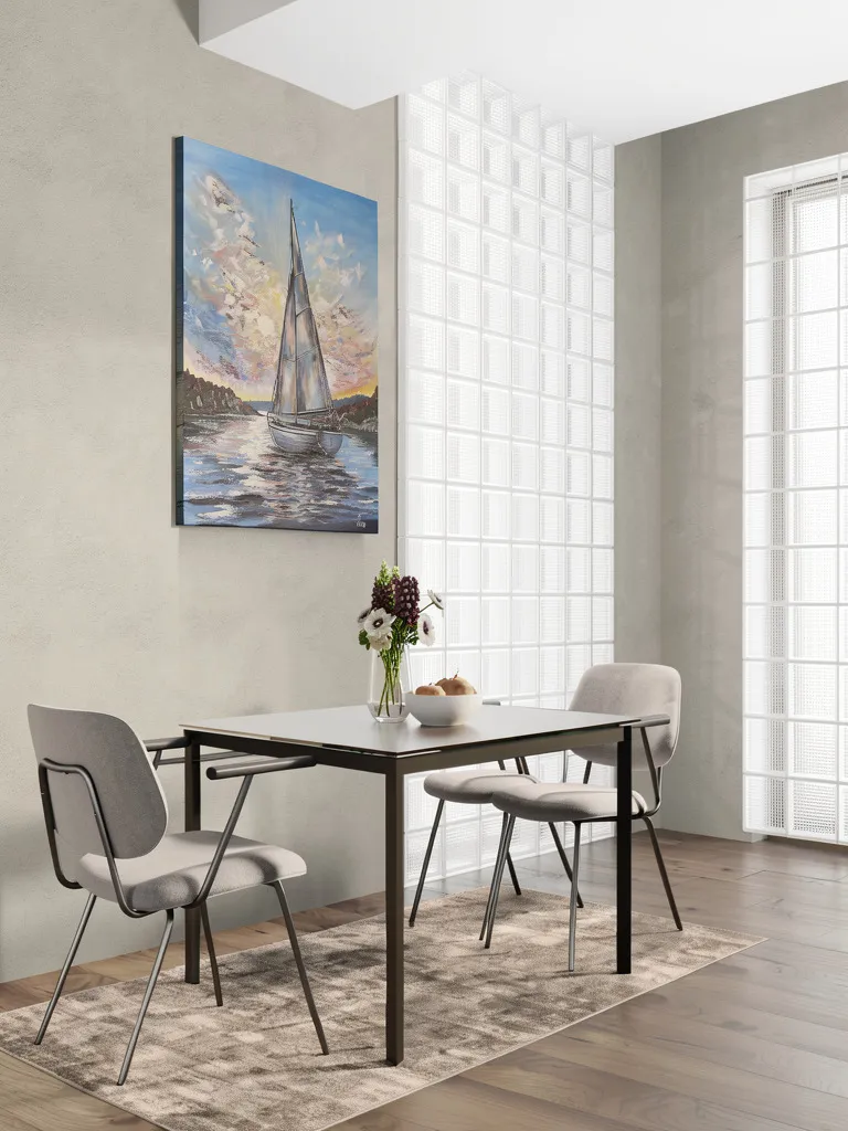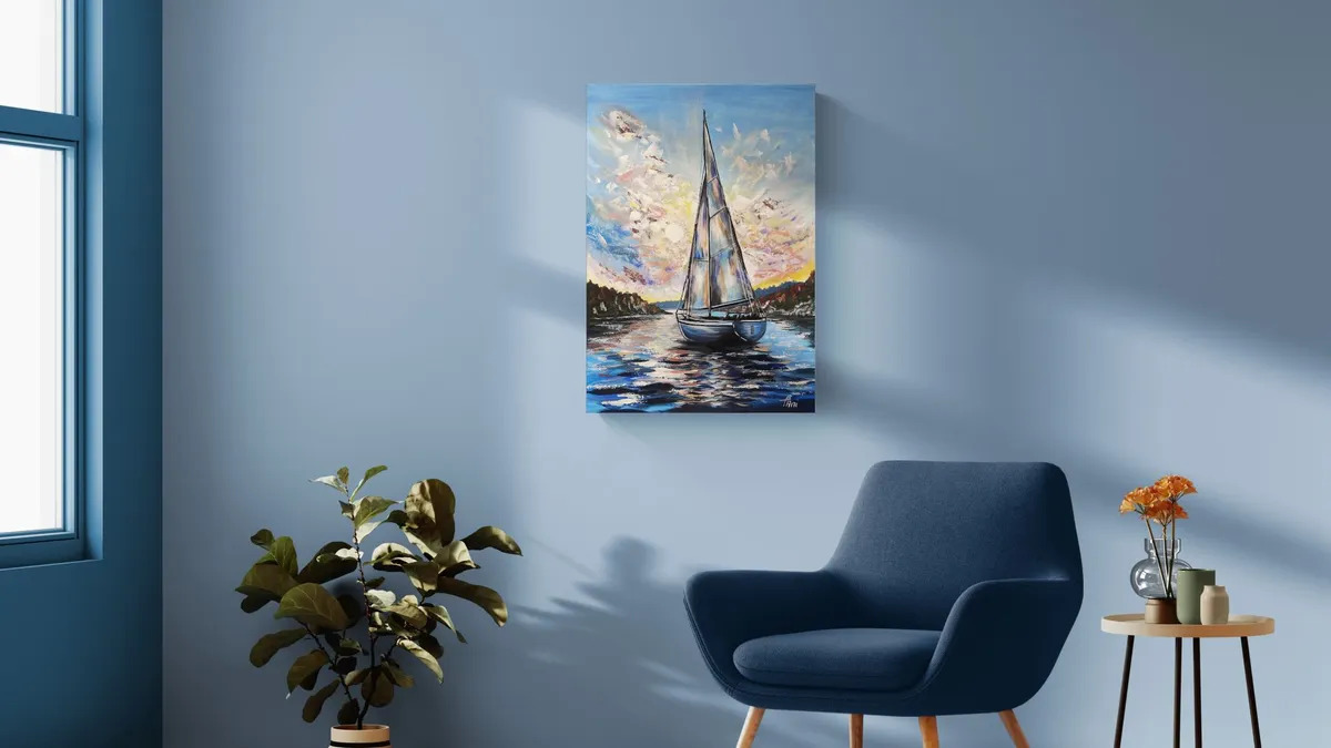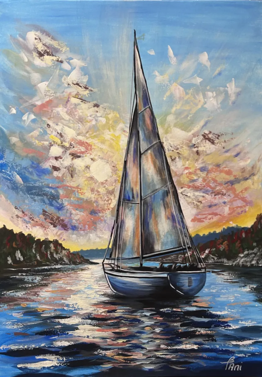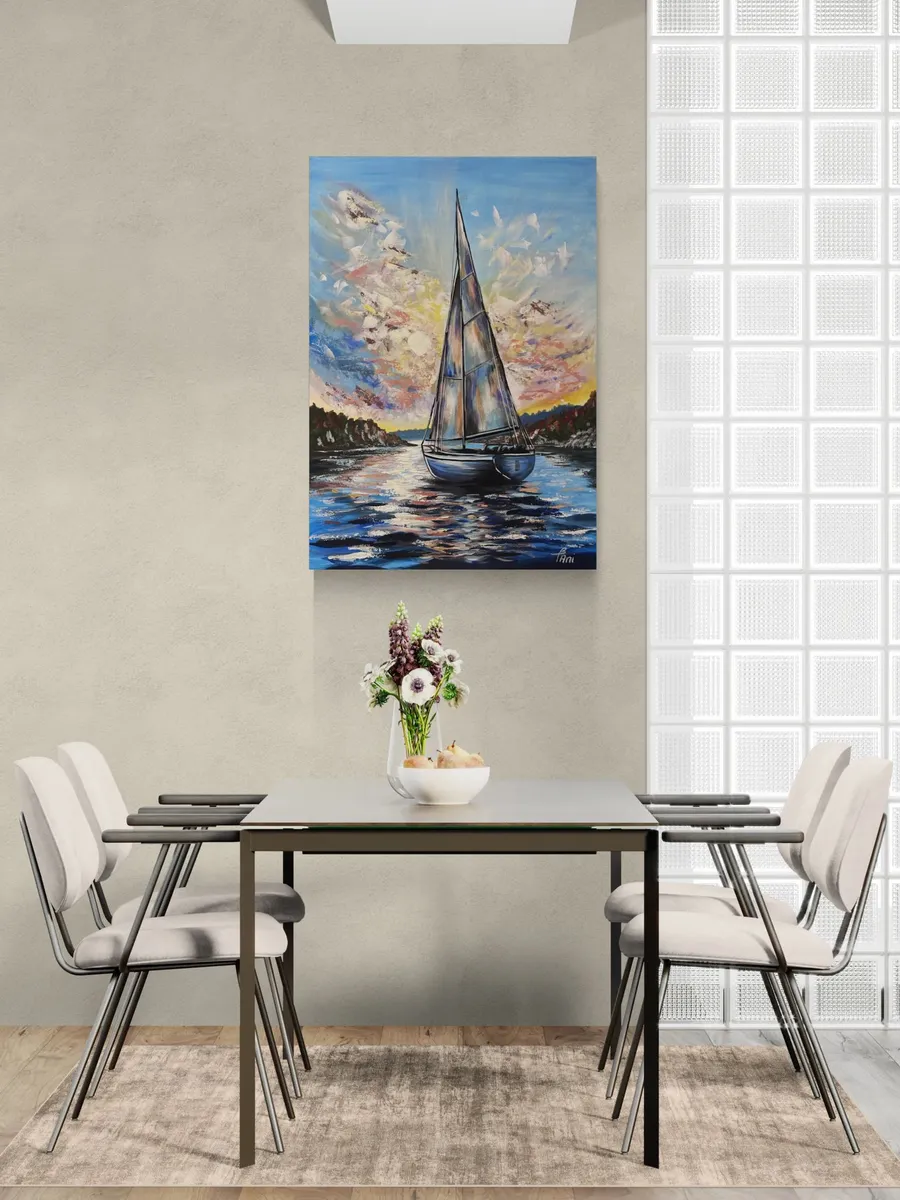 This 50 × 70 cm acrylic painting depicts a sailboat moving toward the light across the water. The composition is centered around motion and direction, symbolizing purpose and forward movement. The dynamic sky and palette knife textures create a powerful sense of energy. The vibrant colors and reflections on the water evoke freedom and inner journey. Layered techniques and mixed media approaches give the artwork depth and a distinctive character. The painting is created with acrylic using mixed techniques (brush and palette knife), and sealed with varnish for durability. Available in multiple sizes upon request. Creation time is 14 working days. Custom commissions are welcome based on individual preferences. Each artwork comes with a Certificate of Authenticity...... Ez az 50 × 70 cm-es akrilfestmény egy vitorlást ábrázol, amely a fény felé halad a vízen. A kompozíció középpontjában a mozgás és az irány áll: a hajó nemcsak halad, hanem célt is sugall. A dinamikus égbolt és a festőkéses technikával kialakított textúrák erőteljes energiát adnak a képnek. A színek játékossága és a fények tükröződése a vízen a szabadság és a belső utazás szimbólumai. A különböző festési rétegek és technikák mélységet és egyedi karaktert kölcsönöznek az alkotásnak. A festmény akrillal, vegyes technikával (ecset és festőkés) készült, lakkozott, így tartós és időtálló. Többféle méretben, megrendelésre is elérhető. Az elkészítés ideje 14 munkanap. Egyedi igényeket megbeszélés szerint vállalok. Minden festményhez eredetiségi bizonyítványt adok.
